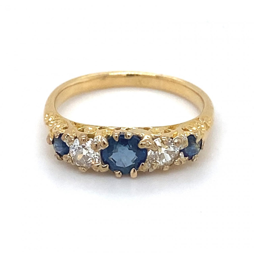 Estate Ring with hand carved London Bridge design featuring five graduated claw setting with 3 x round light Ceylon Sapphires (0.75 carats) and 2 x old European cut Diamonds (0.39 carats), G/H VS1 clarity. Valued at $4,300 (for insurance purposes only)